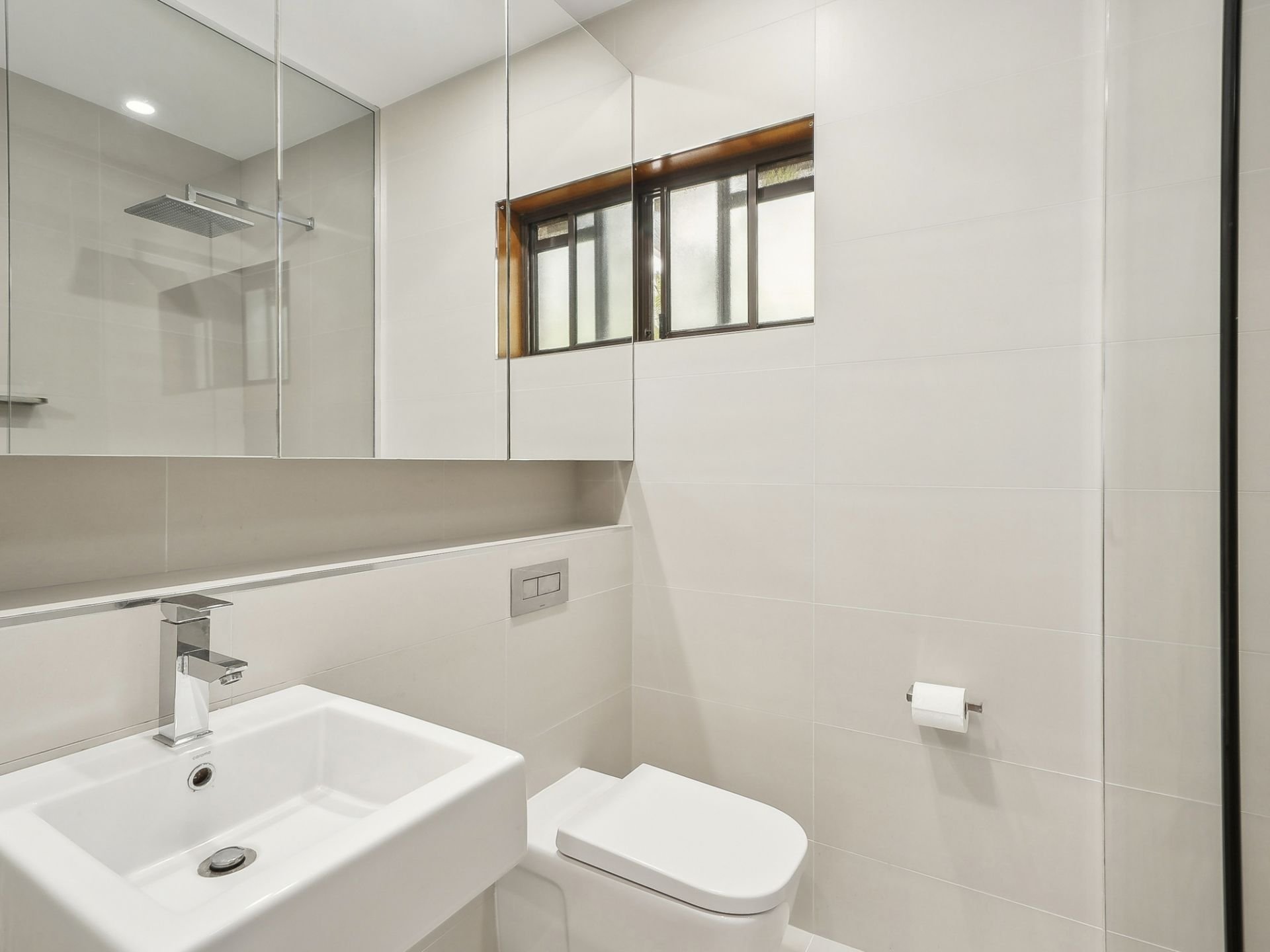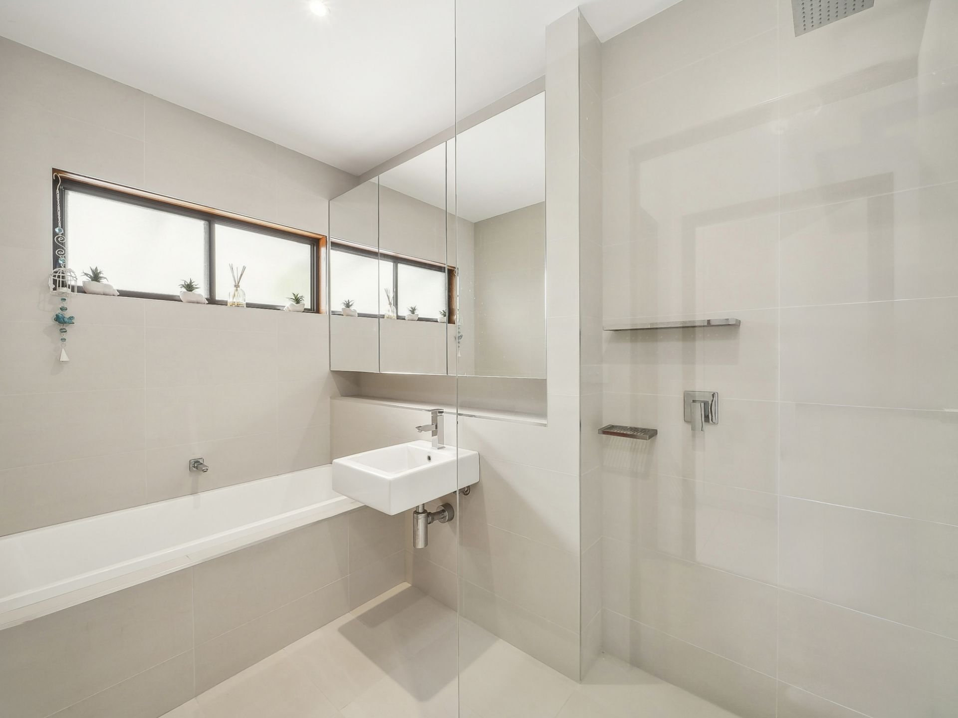 The master suite is a true retreat, featuring his and hers walk-in robes and a modern ensuite with premium fixtures, including a vanity, WC, a walk-in shower, and double shaving cabinets for extra storage + floor-to-ceiling tiles. Bedrooms two and three include built-in robes, and the contemporary main bathroom is finished to the highest standard, featuring floor-to-ceiling tiles, a full bath, vanity, walk-in shower, and additional storage with double shaving cabinets. A separate WC adds extra convenience for family and guests.