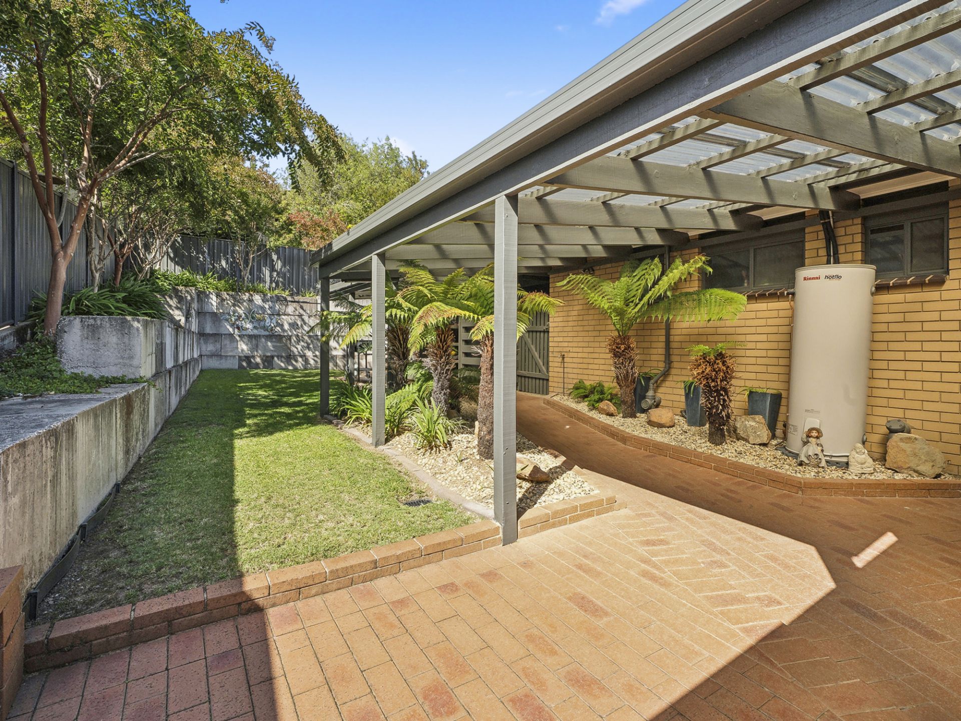 Step outside to an expansive undercover entertaining area, perfectly complemented by an impressive retaining wall crafted from large concrete blocks. The property is fully fenced for privacy and security, with a double carport, storage shed, and a skillion shed offering ample storage solutions. Surrounded by established trees and a meticulously maintained garden, the outdoor space is a peaceful sanctuary, further enhanced by outside blinds for comfort and shade.