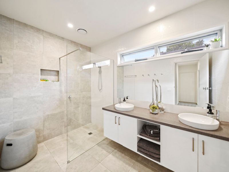The modern bathroom has a large walk in shower and double vanity with Sheridan towels.