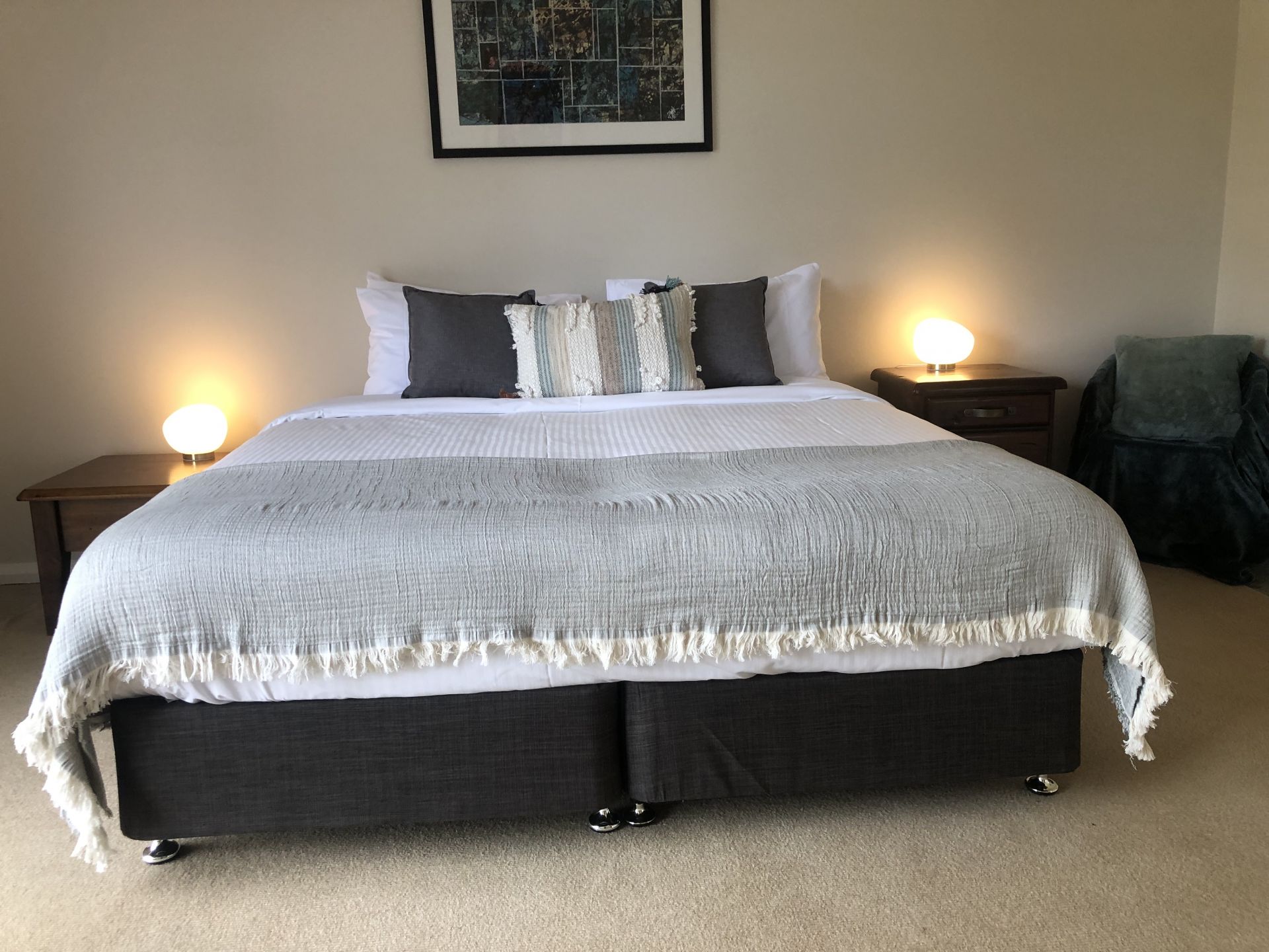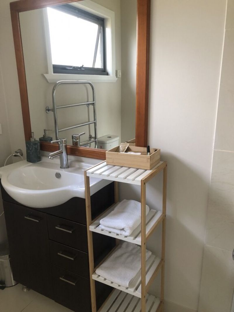 The extensive living space features a large kitchen with modern appliances, a dining table where you will argue for the seats with the best views and two comfortable couches on which you can relax and savour the serenity of simply being there. A large tv and a wide selection of games are provided for your enjoyment. Dual system air conditioners, ceiling fans and a slow combustion heater ensure the house can be kept at a comfortable temperature all year round.
