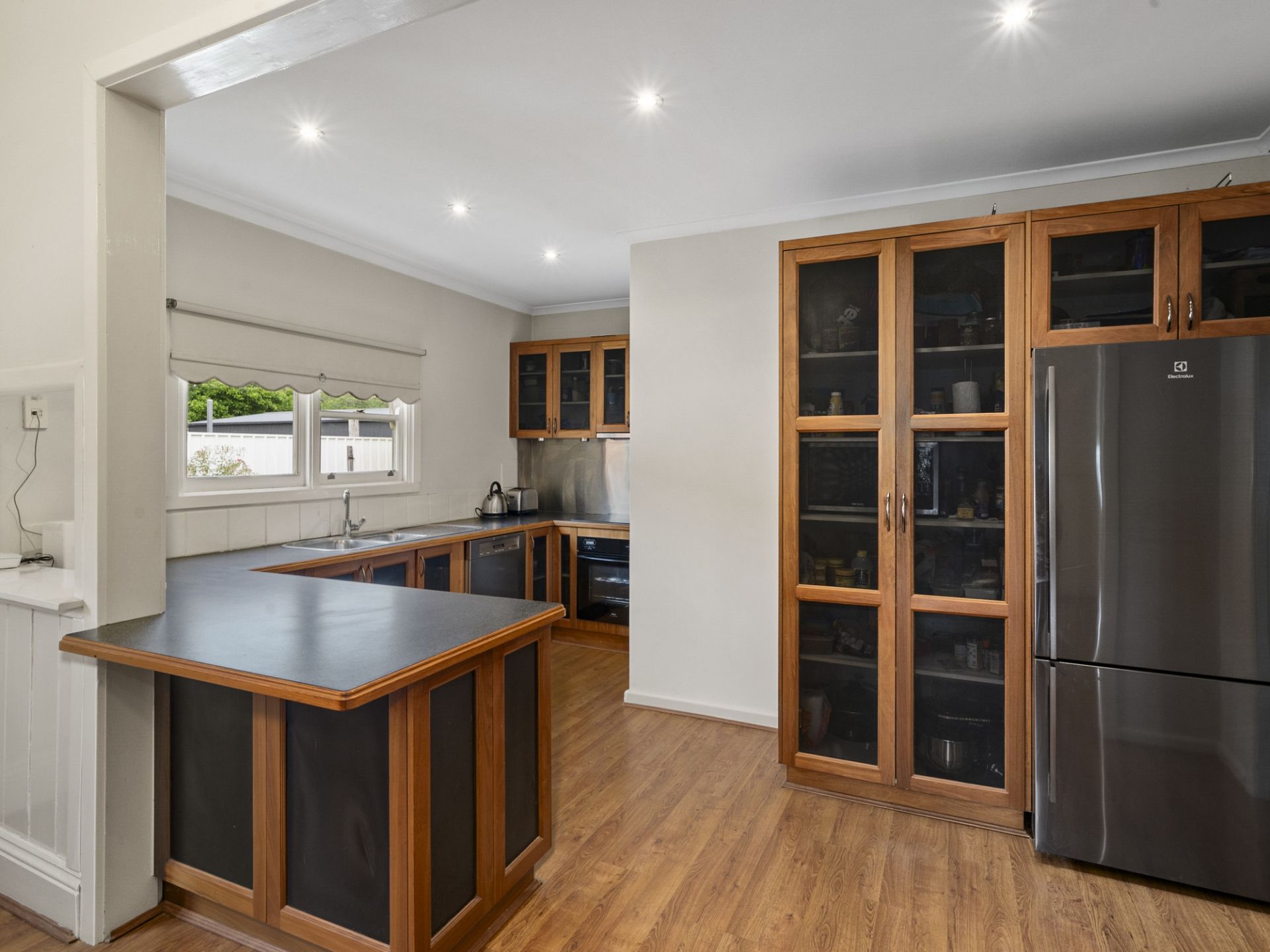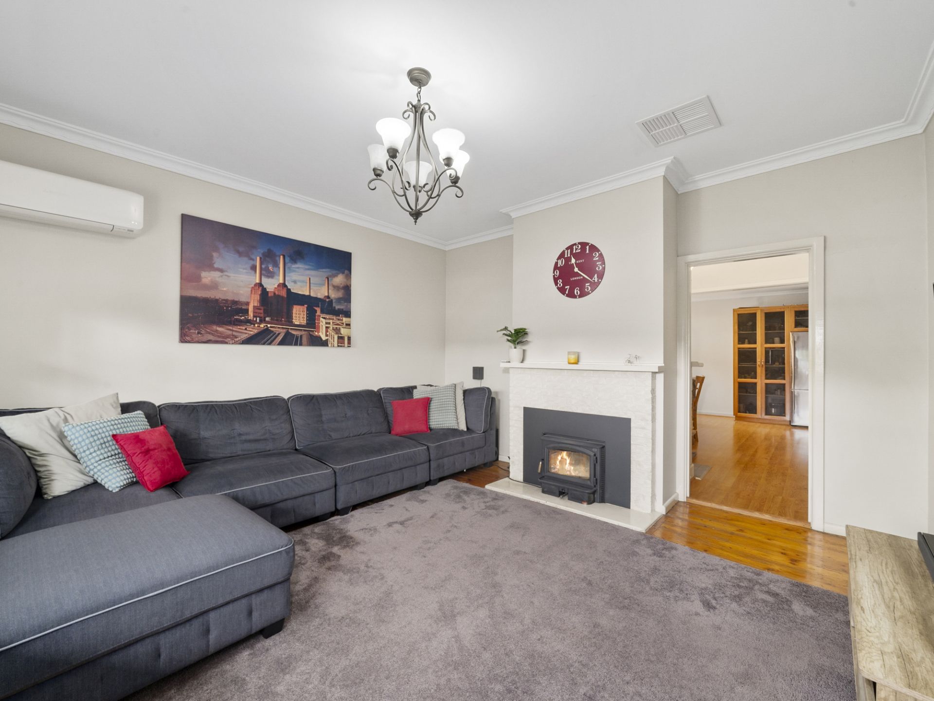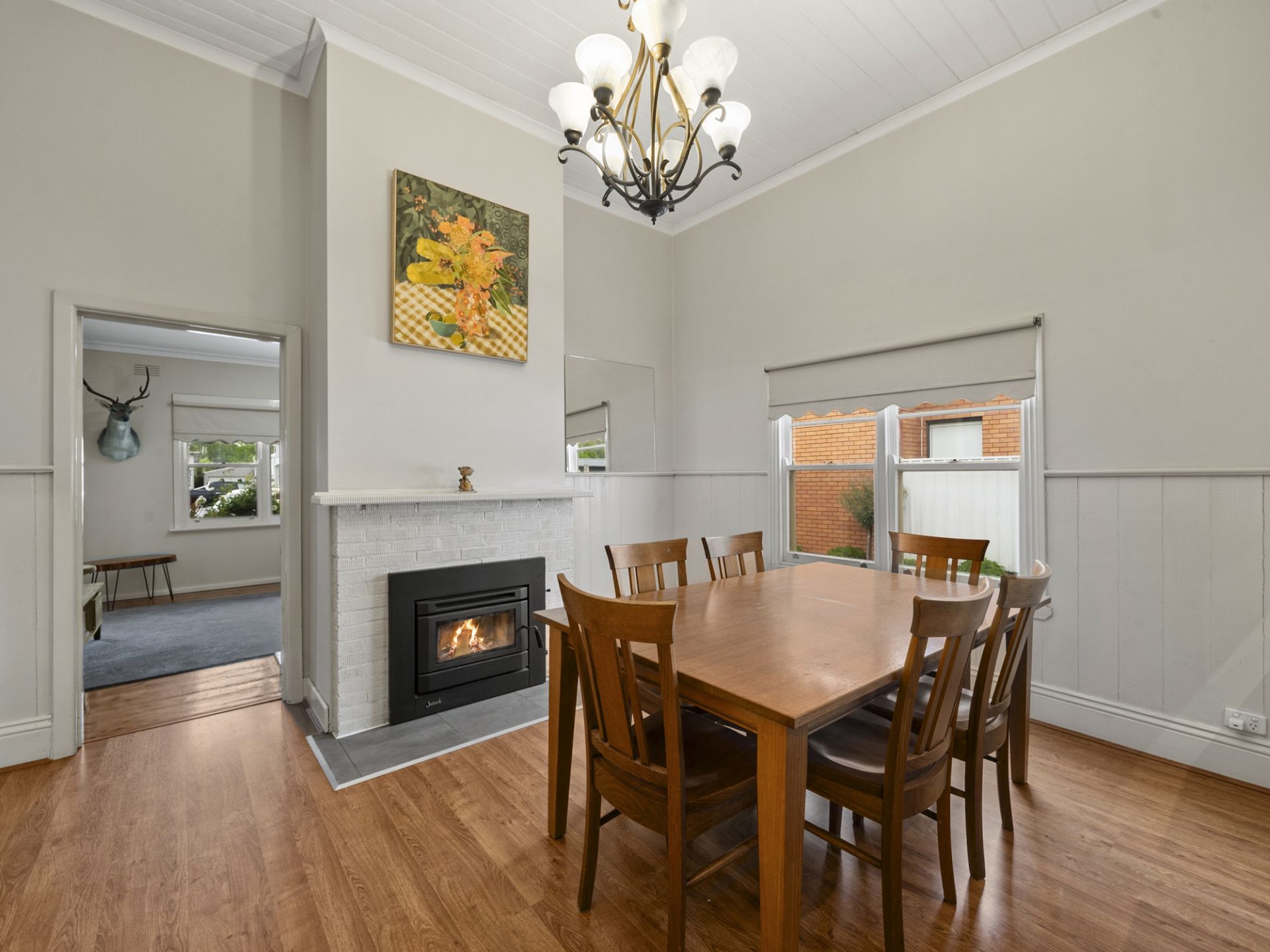 The light-filled formal lounge provides a welcoming retreat, complete with a new built-in wood heater and split-systems for heating and cooling with all year-round comfort. At the heart of the home, the open-plan kitchen and dining, area offers a seamless flow for everyday living and entertaining. The kitchen is well-appointed with an electric cooktop, bench ovens, and a dishwasher, while the adjoining dining space also features a new built-in wood heater, adding warmth and ambiance which then flows through to the lounge area with split system and additional wood heater. A practical laundry with generous bench and cupboard space ensures convenience at every turn.