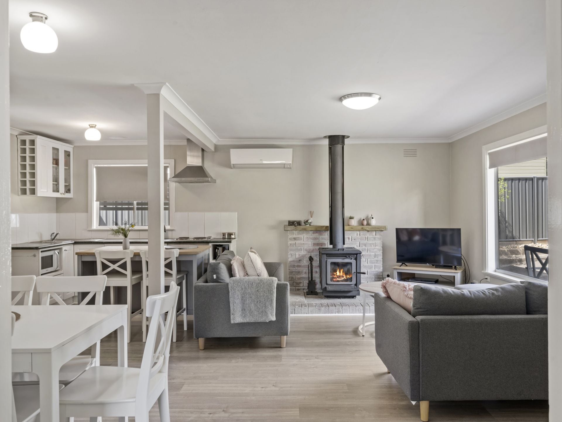 Step inside to discover an inviting open-plan kitchen, dining and living area that welcomes you with warmth and light. The well-equipped kitchen includes an electric cooktop, bench oven, and ample bench, cupboard, and drawer space, making it both functional and stylish. The adjoining living area is a comfortable haven all year round, with a cosy wood heater for winter nights and a split-system air conditioner to keep things cool in summer.